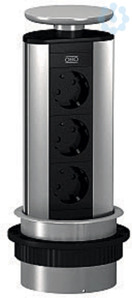 Versenkbare Deskbox mit Anschlusskabel, für den festen Einbau in eine Tischplatte, Befestigungsmanschette aus Kunststoff, passend lackiert in Deckelfarbton. Die Montage erfolgt über eine Bohrung (Ø102 mm) in einer Tischplatte bis maximal 50 mm Stärke.