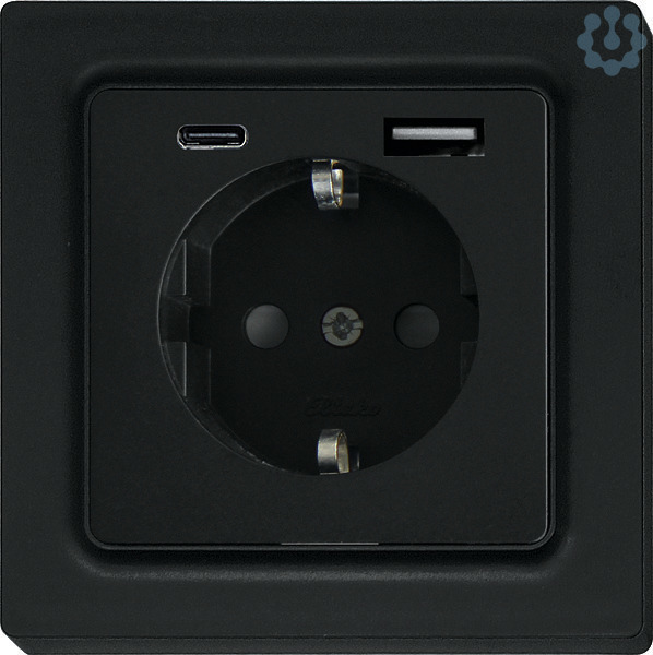Deutsche Schutzkontakt-Steckdose DSS mit Steckdosen-Oberteil und USB-Adapter im E-Design55, 80x80mm außen, Rahmen-Innenmaß 55x55mm. Anthrazit matt. Mit erhöhtem Berührungsschutz. Das Steckdosenunterteil hat Schraubklemmen. Einbautiefe 38mm. Integriertes USB-Netzteil 5V DC/2,8A mit Kurzschluss- und Überlastschutz. Intelligente Parallelnutzung beider USB-Anschlüsse.