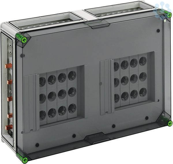 DIAZED(R)-Reiter-Sicherungsgehäuse mit zusätzlichem Anschlussraum, Industrie Qualität, 8 x 3-polige DII-Reiter-Sicherungssockel, E 27-Gewinde, Bemessungsstrom 25 A, Schraubanschluss 1,5-25qmm, auf Sammelschiene 5-polig, mit 5 Sammelschienenklemmen 16-70qmm, N-Klemmen 1,5-16qmm, PE-Klemmen 1,5-16qmm, 4 x Gehäuseverbinder (GGV), auf Sammelschienensystem 250 A, mit transparentem Deckel