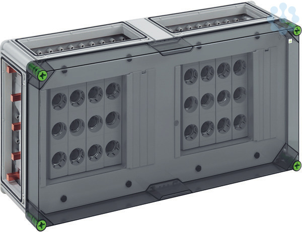 DIAZED(R)-Reiter-Sicherungsgehäuse, Industrie Qualität, 8 x 3-polige DII-Reiter-Sicherungssockel, E 27-Gewinde, Bemessungsstrom 25 A, Schraubanschluss 1,5-25qmm, auf Sammelschiene 5-polig, N-Klemmen 1,5-16qmm, PE-Klemmen 1,5-16qmm, 4 x Gehäuseverbinder (GGV), auf Sammelschienensystem 630 A, mit transparentem Deckel
