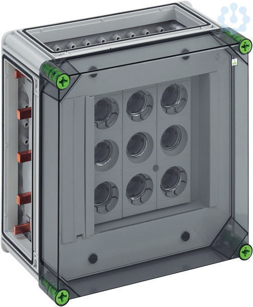 DIAZED(R)-Reiter-Sicherungsgehäuse, Industrie Qualität, 3 x 3-polige DIII-Reiter-Sicherungssockel, E 33-Gewinde, Bemessungsstrom 63 A, Schraubanschluss 1,5-25qmm, auf Sammelschiene 5-polig, mit 5 Sammelschienenklemmen 4-35qmm, N-Klemmen 1,5-16qmm, PE-Klemmen 1,5-16qmm, 3 x Gehäuseverbinder (GGV), auf Sammelschienensystem 400 A, mit transparentem Deckel