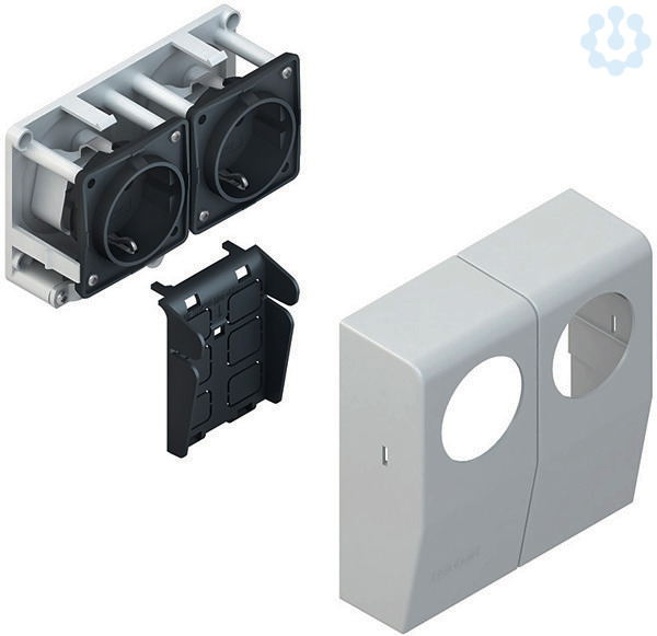 CENTRIC-Doppelschutzkontaktsteckdose, einschließlich 2 Steckdoseneinsätze, zweifach, Tank seitlich offen, anschlussfertig vorverdrahtet, mit Stromartentrennung 5090. Der Anschluss erfolgt über schraubenlose Verbindungsklemmen. Auf Anfrage auch mit Berührungsschutz lieferbar. für Sockelleistenkanalsystem