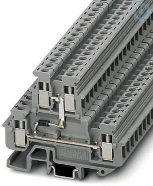 Minidurchgangsklemme, Der max. Strom wird durch die Diode bestimmt. Eingebaut: Diode 1N 4007, Sperrspannung: 1300 V, Dauergrenzstrom: 0,5 A., mit integrierter Diode, Nennspannung: 500 V, Nennstrom: 0,5 A, 1. und 2. Etage, Anschlussart: Schraubanschluss, Bemessungsquerschnitt: 2,5 mm², Querschnitt: 0,2 mm² - 4 mm², Montage: NS 15, NS 35/7,5, NS 35/15, Farbe: grau