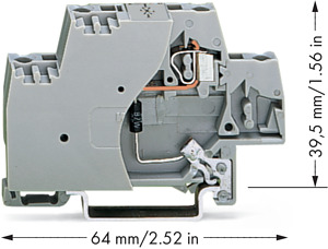 Bauelementklemme. Doppelstock. mit Abschlussplatte und direkter Ableitung auf Tragschiene. mit Transildiode 1.5KE62C. DC 48 V. für Tragschiene 35 x 15 und 35 x 7,5. 2,5 mm². CAGE CLAMP®. 2,50 mm². grau