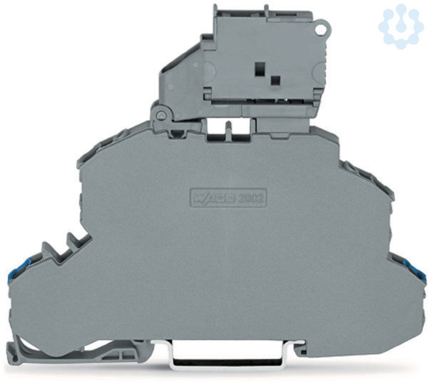 Doppelstock-Sicherungsklemme. mit schwenkbarem Sicherungshalter. Durchgangs-/Sicherungsklemme. für G-Sicherungseinsatz 5 x 20 mm. N/L. ohne Defektanzeige. für Tragschiene 35 x 15 und 35 x 7,5. 2,5 mm². Push-in CAGE CLAMP®. 2,50 mm². grau