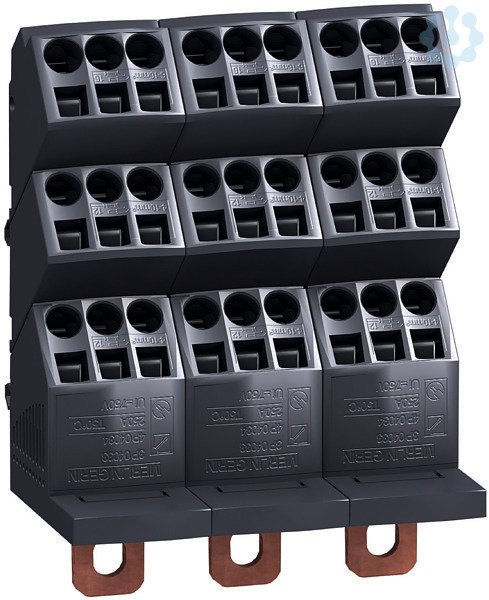 PrismaSeT P. Linergy DP Verteilerblock 3-polig mit einer zulässigen Stromstärke bis 250 A mit Einspeiseanschluss direkt an einen ComPacT NSX oder ComPacT INS bis 250 A und abgangsseitiger Anschlusskapazität für Kabel von 6 x 10 mm² pro Phase. und 3 x 16 mm² pro Phase, mit einer Bemessungsstoßstromfestigkeit (Ipk) 30 kA, Bemessungskurzzeitstrom (Icw) 8.5 kA eff./1s, Bemessungsisolationsspannung (Ui) 750 V AC, Bemessungsspannung (Ue) 690 V AC. Bemessungsstoßspannungsfestigkeit (Uimp) 8 kV, mit Schutzart IPxxB zur Montage auf einer DIN-Schiene oder auf einer Montageplatte mit einer Breite von 105 mm, einer Höhe von 138 mm und einer Tiefe von 63 mm.