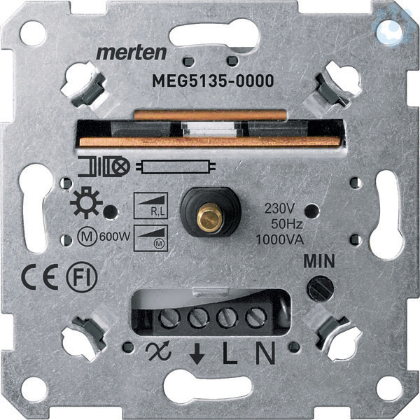Für dimmbare, gewickelte Trafos, Glühlampen und 230 V-Halogenlampen (induktive/ohmsche Last). (Phasenanschnitt). Mit Druck-Ausschalter. Nennleistung 60-1000 VA. Motor Last 60-600 VA. Neutralleiter erforderlich. Zu komplettieren mit Zentralplatte mit Drehknopf System M MEG5250-03xx/-04xx/-06xx Zentralplatte mit transparenter Abdeckung und Drehknopf M-Creativ MEG5250-3500. Zentralplatte mit Drehknopf System Design MEG5250-60xx, System Fläche MEG5250-40xx/-41xx/-42xx Hinweis Informationen zum Thema Dimmen von LED Leuchtmittelnerhalten Sie im Internet unter Merten Dimmertest. http//www