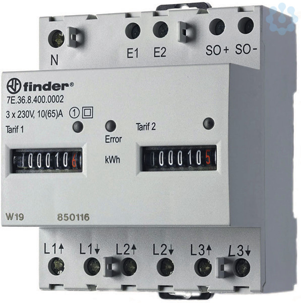 Elektronischer Wirkstromzähler für 3-Phasen Drehstrom, max. Strom 65 A, 2-Tarifzähler (Tag und Nacht), Genauigkeitsklasse 1/B, für 35 mm DIN Schiene EN 60715 TH35, Baubreite 70 mm, Nennspannung 3 X 230 V AC, SO-Schnittstelle nach DIN 43864 (100 Impulse pro kWh), plombierbar, MID konform. Anschlussquerschnitte Hauptstromkreis: eindrähtig 1,5-16 mm², mehrdrähtig 1,5-16 mm².