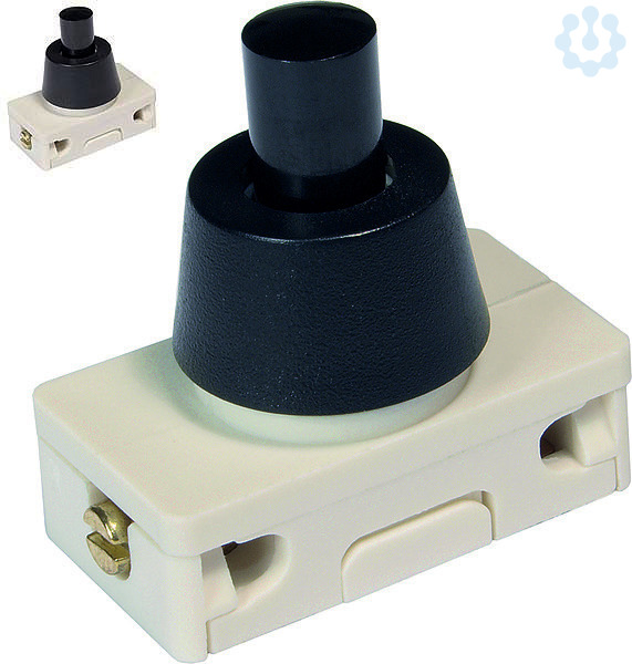 Druckknopfschalter Serie 3030. 2(1) A, 250V~. Ausschalter, 1-polig, T 85° C, Gewindelänge: 7,5mm. Glockenmutter aufgeschraubt, schwarz