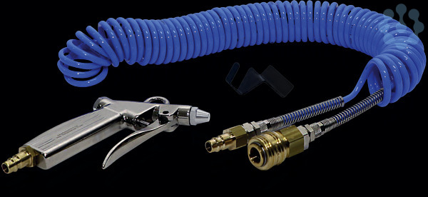 Set enthält Pistole, Verlängerungsrohr, Spiralschlauch, Kupplungen und