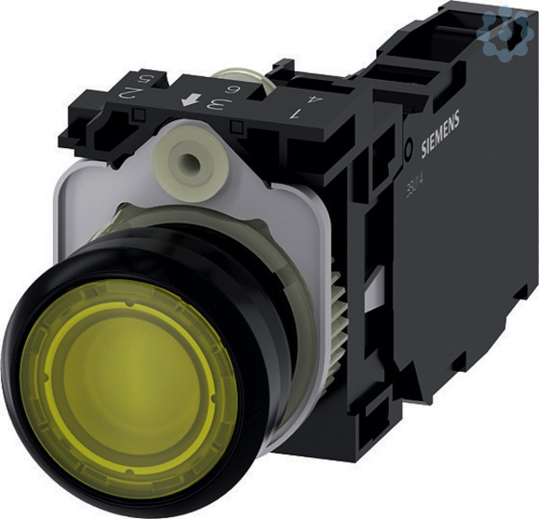 Leuchtdrucktaster, 22 mm, rund, Kunststoff, gelb, Druckknopf, flach, tastend, mit Halter, 1S+1Ö, LED-Modul mit integrierter LED AC/DC 24V, Schraubanschluss Leuchtdrucktaster SIRIUS ACT zur Schaltung und Steuerung elektrischer Verbraucher.Unter dem Markennamen SIRIUS ACT bietet Siemens ein einzigartiges Portfolio an Befehls- und Meldegeräten mit weltweiten Produkt-Zulassungen in vier modernen Designreihen aus robustem Echtmetall und hochwertigem Kunststoff.Das innovative Aufschnappkonzept vereinfacht die Montage so weit, dass dafür nur eine Hand und kein Spezialwerkzeug erforderlich ist. Als Montagebohrungen genügen nutfreie Löcher, da bereits ein 100%iger Verdrehschutz integriert ist.Dank der durchgängig hohen Schutzart sind die robusten Geräte industrietauglich und für den Außeneinsatz geeignet. Sogar die Reinigung mit Hochdruckstrahl ist möglich. Weder Staub, Öle noch aggressive Laugen können den zuverlässigen Betrieb stören.Neben der Standardverdrahtung können die Geräte auch über PROFINET, AS-Interface od