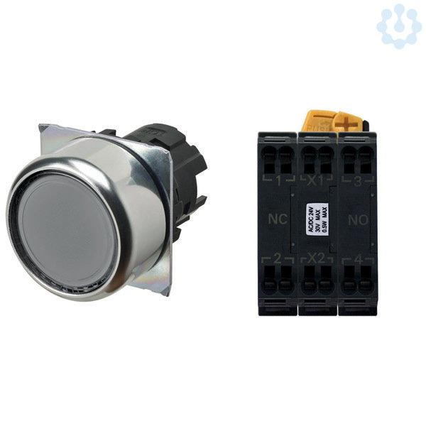 Drucktaster A22NL Ø22, Metalloptik, flach, tastend, CAP COLOR Transparent weiss, LED weiss, 1NO1NC, 24 VDC, push-in terminal