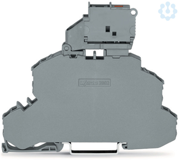 Doppelstock-Sicherungsklemme. mit schwenkbarem Sicherungshalter. Durchgangs-/Sicherungsklemme. für G-Sicherungseinsatz 5 x 20 mm. mit Defektanzeige durch LED. 120 V. für Tragschiene 35 x 15 und 35 x 7,5. 2,5 mm². Push-in CAGE CLAMP®. 2,50 mm². grau