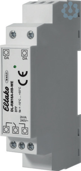 Modul zum Steuern eines Relaiskontakts über den DALI-Bus (DT7) für Tragschiene DIN-EN 60715 TH35. 98x17,5x56mm. Schutzart IP20. DALI-Stromaufnahme 2,7mA. Kompaktes Relaismodul zum direkten Ansteuern von 230V AC-Lasten über DALI. Einfaches Einbinden von Lasten ohne DALI-Eingang in einen DALI-Kreis, die Lasten können über DALI-Befehle ein- und ausgeschaltet werden. Die Funktion des Geräts entspricht dem Standard für DALI Device Type 7 ? Schaltfunktion (ab Firmware 2.0). Einstellbares Verhalten für Power-Up und für Wegfall der Busversorgung. Die Versorgung des DALI-RM16 erfolgt über den DALI-Bus, es ist keine zusätzliche Versorgung notwendig. Einschalten im Nulldurchgang. Integrierte Einschaltstrombegrenzung, besonders geeignet für Lasten mit sehr hohem Einschaltstrom (>100A). Das Interface repräsentiert einen Teilnehmer am Bus und ist entsprechend adressierbar. Konfiguration über PC-Software DALI-Cockpit. DALI-Funktionen und Befehlssatz: Der DALI-RM16 bietet die Möglichkeit Lasten an den DALI-Bus anzubinden un