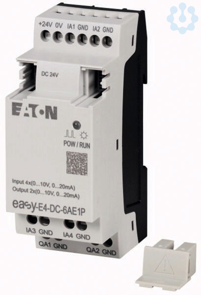 Ein-/Ausgangserweiterung für die Steuerrelais der Serie easyE4 mit einer Bemessungsbetriebsspannung von 24 VDC. Diese Erweiterung stellt zur Verfügung: 4 analoge Eingänge die wahlweise nutzbar sind als Spannungseingänge (0-10V) oder Stromeingänge (0/4-20mA) und 2 analoge Ausgänge die wahlweise nutzbar sind als Spannungsausgänge (0-10 V) oder Stromausgänge (0/4-20 mA). Die Anschlüsse erfolgen per Push-In-Klemmen. Die Verbindung zum Steuerrelais oder einer anderen Erweiterung der Serie easyE4 erfolgt mittels Verbindungsstecker EASY-E4-CONNECT1 (Artikel 197225) der im Lieferumfang enthalten ist.