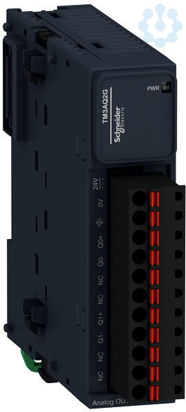 Analoge Ausgangsmodule Modicon TM3. Modul TM3, 2 analoge Ausgänge. Abstand 5,08, Anschluss Feder, Auflösung 12 Bit oder11 Bit +Vorzeichen, Ausgang ?10 bis +10 VDC,0 bis +10 VDC/0-20 mA,4-20 mA.