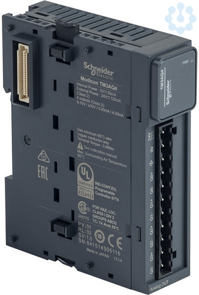 Analoge Ausgangsmodule Modicon TM3. Modul TM3, 4 analoge Ausgänge. Abstand 5,08, Anschluss Schraub, Auflösung 12 Bit oder11 Bit +Vorzeichen, Ausgang ?10 bis +10 VDC,0 bis +10 VDC/0-20 mA,4-20 mA.