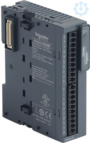 Analoge gemischte E/A-Module Modicon TM3. Modul TM3, 4 analoge Ausgänge und 2 analoge Eingänge. Abstand 3,81, Anschluss Schraub, Auflösung 12 Bit oder11 Bit + Vorzeichen(fürE und A), Ausgang ?10 bis +10 VDC,0 bis +10 VDC/0-20 mA, 4-20 mA, Eingang_K ?10 bis +10 VDC,0 bis +10 VDC/0-20 mA,4-20 mA.