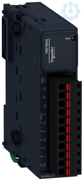 OptionenAnaloge E/A-Module. Analoge gemischte E/A-Module Modicon TM3. Modul TM3, 2 Temperatureingänge und 1 analoger Ausgang. Abstand 5,08, Anschluss Feder, Auflösung 16 Bit oder15 Bit +Vorzeichen(für E)12 Bit oder11 Bit +Vorzeichen(für A), Ausgang ?10 bis +10 VDC,0 bis +10 VDC/0-20 mA, 4-20 mA. Eingang_K Thermoelemente(J, K, R, S, B, T, N, E, C), Temperaturfühler(RTDs) (Ni100, Ni1000, PT100, PT1000)?10 bis +10 VDC,0 bis +10 VDC/0-20 mA, 4-20 mA.