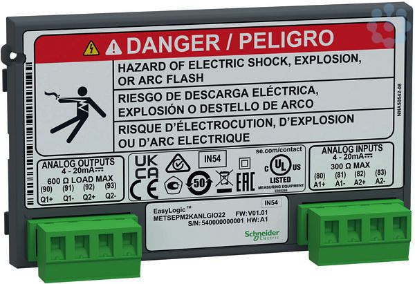 Analog-E/A-Optionsmodul, das mit den PowerLogic PM2x30 Geräten kompatibel ist und zusätzliche analoge Ein- und Ausgänge bietet. 2 Analogeingänge (4-20 mA). 2 Analogausgänge (4-20 mA) für Ströme, Spannungen,Leistung, Leistungsfaktor. Analoge Ein- und Ausgänge werden über die ION-Setup-Software eingerichtet und konfiguriert. Die Optionsmodule werden auf der Rückseite des Zählers angebracht und dienen zum Anschluss der Steuerspannung und des Schnittstellenbusses. Die PowerLogic-Geräte PM2x30 erlauben maximal 1 Ein-/Ausgangs-Optionsmodul pro Zähler.