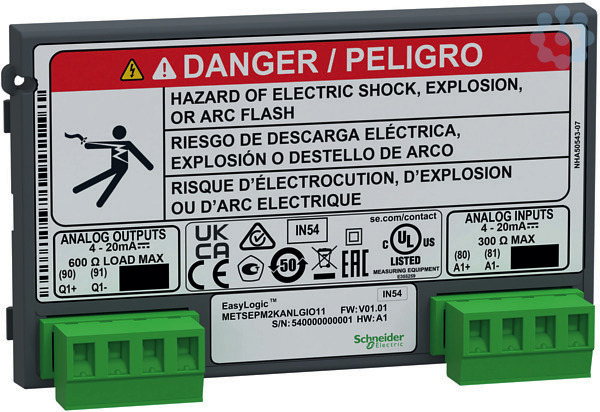 Analog-E/A-Optionsmodul, das mit den PowerLogic PM2x30 Geräten kompatibel ist und zusätzliche analoge Ein- und Ausgänge bietet. 1 Analogeingang (4-20 mA). 1 Analogausgang (4-20 mA) für Ströme, Spannungen,Leistung, Leistungsfaktor. Analoge Ein- und Ausgänge werden über die ION-Setup-Software eingerichtet und konfiguriert. Die Optionsmodule werden auf der Rückseite des Zählers angebracht und dienen zum Anschluss der Steuerspannung und des Schnittstellenbusses. Die PowerLogic-Geräte PM2x30 erlauben maximal 1 Ein-/Ausgangs-Optionsmodul pro Zähler.