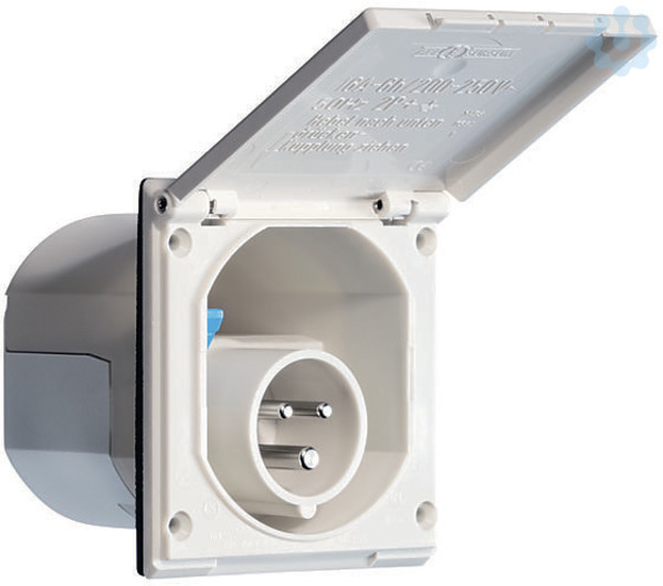 CEE Einbau-Einspeisungsstecker, VDE 0623, EN 60309 Teil 1/2, ICE 60309, Schutzart spritzwassergeschützt IP44, Nennstrom 16A, 3-polig, Nennspannung 230V AC, 6h, blau, Gehäusefarbe weiß