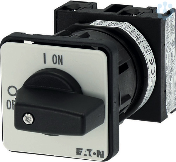 EIN-AUS-Schalter, Sortiment: EIN-AUS-Schalter, Typkenner: T0, mit schwarzem Knebel und Frontschild, 2-polig, Schutzart: Front IP65, Bauform: Zentraleinbau, Schaltwinkel: 90 °, Schaltverhalten: rastend, Frontschild: 0-1, Bemessungsbetriebsleistung AC-23A, 50 - 60 Hz 400 V: P = 5.5 kW, Bemessungsdauerstrom: Iu = 20 A, 1 Baueinheit(en), Normen und Bestimmungen: IEC/EN 60947, VDE 0660, IEC/EN 60204, CSA, UL, Lasttrennschalter nach IEC/EN 60947-3