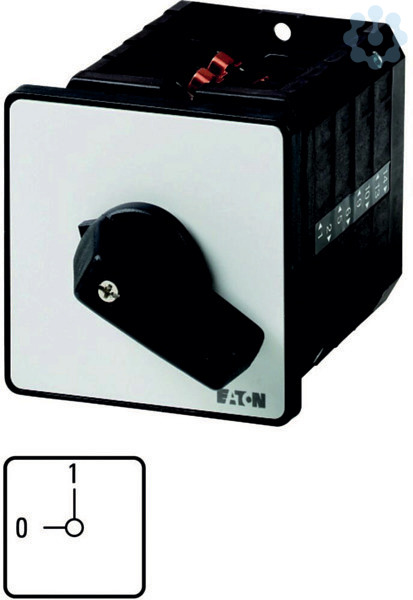 EIN-AUS-Schalter, Sortiment: EIN-AUS-Schalter, Typkenner: T5B, STOPP-Funktion: NOT-AUS-Funktion, mit rotem Knebel und gelbem Frontschild, 2-polig, Schutzart: Front IP65, Bauform: Einbau, Schaltwinkel: 90 °, Schaltverhalten: rastend, Frontschild: 0-1, Bemessungsbetriebsleistung AC-23A, 50 - 60 Hz 400 V: P = 30 kW, Bemessungsdauerstrom: Iu = 63 A, 1 Baueinheit(en), Normen und Bestimmungen: IEC/EN 60947, VDE 0660, IEC/EN 60204, CSA, UL, Lasttrennschalter nach IEC/EN 60947-3