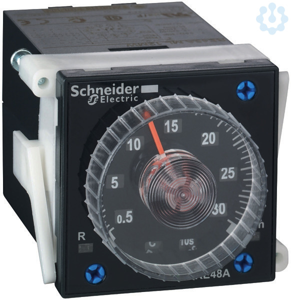 Zelio Time. Dieses Zeitrelais ist für den Fronteinbau in Gehäusen oder Schaltschränken vorgesehen, bei denen Anwender über einen großen Regler die Zeit jederzeit und einfach einstellen können. Dazu ist ein quadratischer Ausschnitt von 48x48 mm notwendig. Nach dem Einbau wird auf der Rückseite die Verdrahtung an Relaissockel vorgenommen und dieser einfach angesteckt. Somit ist eine einfache Installation und schneller Wechsel ohne Lösen der Verdrahtung möglich. Über 2 LEDs wird der Status angezeigt. Anzahl Zeitfunktionen 4. Zeitfunktion Ansprechverzögerung, Rückfallverzögerung, Blinker/Taktgeber symmetrisch, Impulsformer. Zeitbereich 0,02 s-300 h. Ausgänge 2 Relaiswechsler, belastbar jeweils bis 5 A. Betriebsspannung 24-240 VAC/DC. Anschluss 11polige Rundsteckverbinder.
