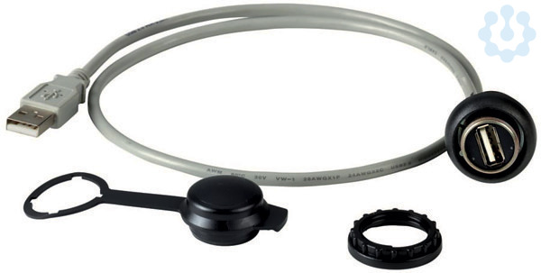 Einbaubuchse, Allgemeines Zubehör, konfektionierte Leitung mit fest angeschlossenem Stecker USB 3.0, Typ A, Leitungslänge: 0,6 m, Schutzart: IP65 (mit geschlossener Abdeckung), IP20 (mit Stecker in gestecktem Zustand), Frontring Schwarz, Anbindung an SmartWire-DT: nein, verwendbar für: Frontmontage, Pole: 9