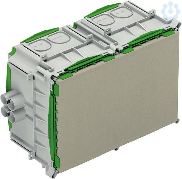 Universelles Einbaugehäuse, für Fertigteilbau, halogenfrei, zum Einbau von NV/HV/LED-Leuchten und Lautsprechern, Melde- und Rufsystemen, geeignet für Klebebefestigung, für die Installation von VDE geprüften Leuchten nach DIN EN 60598 (VDE 0711), sowie mit F-Kennzeichnung oder MM-Kennzeichnung, maximale Einbauhöhe für Leuchten, Lautsprecher, Melde und Rufsystemen: 130mm, Lampenleistung Halogen max. 100 W, Lampenleistung LED max. 47 W, zusätzliche Einführungen 8 x bis M40, Auslassöffnung: Fermacell(R)-Platte, variabel bis max. 200 x 300mm, 8 Kombi-Rohr-Einführungen 4 x M20, M25, 4 x M25 integrierte Rohrstopper und Zugentlastung für Rohre M20, M25