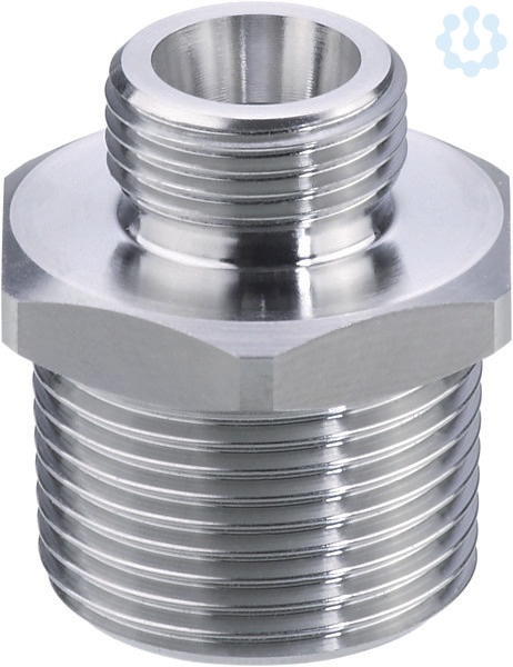 Einschraubadapter für Prozesssensoren. Sensorikanschluss M18 x 1,5 Innengewinde. Prozessanschluss R 3/4 Außengewinde. 1.4404 (Edelstahl / 316L). Druckfestigkeit 100 bar