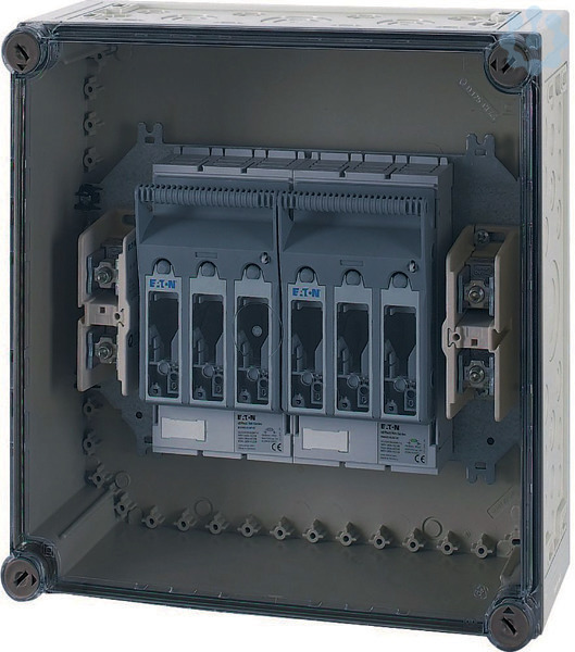Einzelgehäuse mit 2x NH-Sicherungs-Lasttrennschalter, Material Polycarbonat, schlagfest, Schutzart IP65, metrische Vorprägungen in allen Seitenwänden, Sicherungsunterteil aufgebaut auf Montageplatte aus 3mm Stahlblech, Befestigungslaschen für Wandbefestigung, plombierbare Deckelverschlüsse, Deckel durchsichtig rauchgrau, Klemme für Anschluss des 4. Leiters (PE/N), Bemessungsbetriebsstrom Ie= 2x 150 A, Sicherungseinsatz NH00, Nachrüstbare Klemme für den 5. Leiter=K95/1, Sicherungseinsätze bitte separat bestellen.