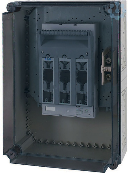 Einzelgehäuse mit 1x NH-Sicherungs-Lasttrennschalter, Material Polycarbonat, schlagfest, Schutzart IP65, metrische Vorprägungen in allen Seitenwänden, Sicherungsunterteil aufgebaut auf Montageplatte aus 3mm Stahlblech, Befestigungslaschen für Wandbefestigung, plombierbare Deckelverschlüsse, Deckel durchsichtig rauchgrau, Klemme für Anschluss des 4. Leiters (PE/N), Bemessungsbetriebsstrom Ie=250 A, Sicherungseinsatz NH1, Nachrüstbare Klemme für den 5. Leiter=K150/1, Sicherungseinsätze bitte separat bestellen.