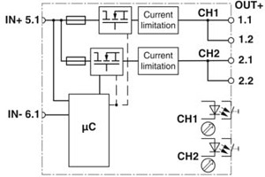 Zweikanaliges elektronisches Geräteschutzschalter-Modul zum Schutz von Verbrauchern an 12+24 V DC bei Überlast und Kurzschluss. Nennstrom über Stufenschalter einstellbar von 1 A bis 4 A. Zur Installation auf DIN-Tragschiene über die CAPAROC Stromschienen.