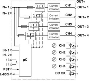 Mehrkanaliger, elektronischer Geräteschutzschalter mit aktiver Strombegrenzung zum Schutz von vier Verbrauchern an 24 V DC bei Überlast und Kurzschluss. Mit Nennstrom-Assistent und elektronischer Verriegelung der eingestellten Nennströme. Zur Installation auf DIN-Schienen.