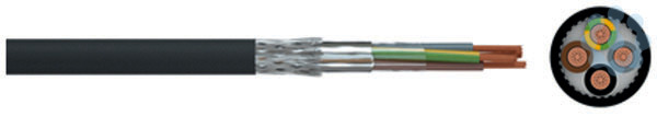 Spezielle Leitung für das EMV-gerechte Anschließen von Frequenzumrichtern. Für die Verwendung bei mittleren mechanischen Beanspruchungen bei fester Verlegung und gelegentlicher Bewegung in Innenräumen und im Freien, jedoch nicht in Erde.