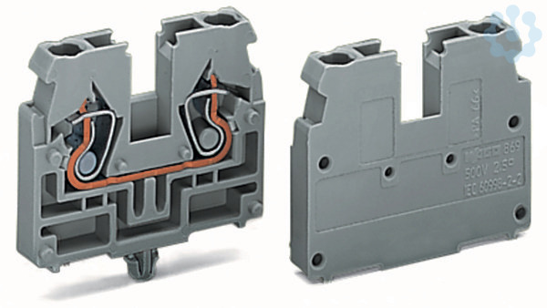 2-Leiter-Endklemme. ohne Drücker. mit Rastfuß. für Blechdicke 0,6 - 1,2 mm. Befestigungsloch Ø 3,5 mm. 2,5 mm². CAGE CLAMP®. 2,50 mm². lichtgrau