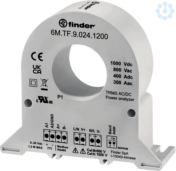 Einphasen Energie-Messwandler für TRMS AC und DC Messungen, 300A - 800 V AC / 400A - 1000 V DC, Modbus RS485 Kommunikationsschnittstelle, Messung der Momentanwerte von: V (RMS), A (RMS), PF, kW, kVA, kvar, Hz, THD (I), Vpk, Ipk, Cos?, Bidirektionale Energiemessung: kWh, Genauigkeitsklasse: 0.5% F.S., Verfügbare Messregister: MSW first, LSW first oder Hundertstel, Komplett konfigurierbar über Modbus RS485 Schnittstelle, Versorgungsspannung 24 V DC, für Tragschiene 35 mm (EN 60715) (Tragschienenadapter im Beipack enthalten)