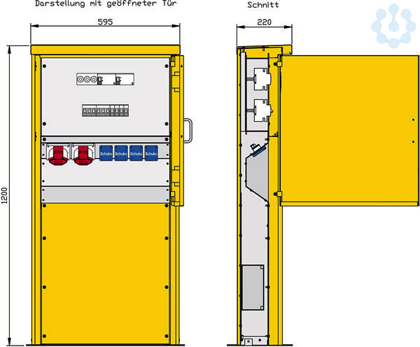 Anschluss der Versorgungsleitungen Tür mit Griff und Kugelschnapper Kabelausführung bei geschlossener Tür möglich Schutzart: IP44 Größe ca.: 1200 x 595 x 220mm / H-B-T