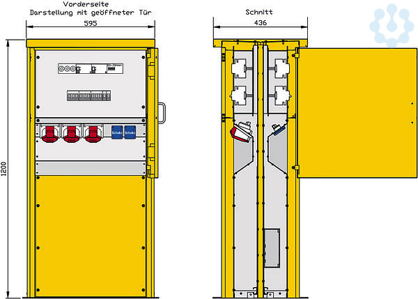 Anschluss der Versorgungsleitungen Türen mit Griffen und Kugelschnappern Kabelausführungen bei geschlossenen Türen möglich Schutzart: IP44 Größe ca.: 1200 x 595 x 436mm / H-B-T