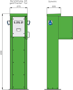 Anschluss der Versorgungsleitungen Tür mit Griff und Kugelschnapper Kabelausführung bei geschlossener Tür möglich Schutzart: IP44 Größe ca.: 1200 x 275 x 220mm / H-B-T