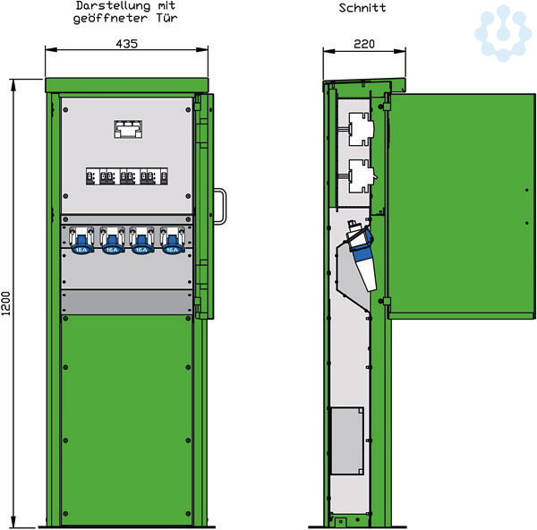 Anschluss der Versorgungsleitungen Tür mit Griff und Kugelschnapper Kabelausführung bei geschlossener Tür möglich Schutzart: IP44 Größe ca.: 1200 x 435 x 220mm / H-B-T