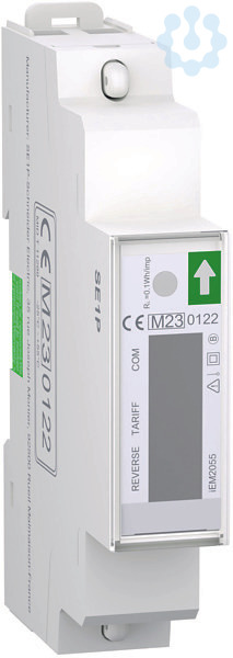 Acti 9 iEM2000 Baureihe. iEM2055 Energiezähler, 1-phasig, Modbus. Ausgang_S0 ja, COM Modbus, MID ja, max. Strom 45, TE 1. Wechselstromzähler zur Direktmessung. Digitaleingang für Tarifumschaltung, Teilzähler mit Resetfunktion, erweiterte Messfunktion Wirk- & Blindenergie (Bezug & Abgabe), Strom, Spannung, Wirk- & Blindleistung, Leistungsfaktor, Frequenz bei kommunikativen Varianten. Genauigkeit Klasse 1 (IEC 62053-21 und IEC61557-12) bzw. Klasse B (EN50470-3). Kommunikationsoptionen M-Bus oder Modbus RTU (RS 485). Messgeräterichtlinie MID 2004/22/EG muss das Messgerät in einem Schrank oder Gehäuse mit Schutzart IP51 oder besser verbaut sein.