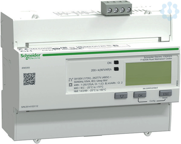 Acti 9 iEM3000 Baureihe. iEM3355 Energiezähler, 3-phasig, 1E/1A, 4 Tarife. Ausgang_K 1, COM Modbus, Eingang_K 1, MID Ja, max. Bemessungsstrom 125 A. Drehstromzähler für Direktmessung bis 125 A. Anzeige vollgraphische LCD-Anzeige zur gleichzeitigen Klartextdarstellung von Menüpunkt/Messkategorie, Messwert, Einheit sowie aktivem Tarif. Teilzähler werden mit Zeitstempel (Datum&Uhrzeit) der letzten Rücksetzung angezeigt bzw. kommuniziert. Messfunktion Gesamt-Wirkenergiezähler ohne Resetfunktion und Teil-Wirkenergiezähler mit Resetfunktion. erweiterte Messfunktion für Energiezähler über Anzeige und Kommunikation Wirk-/Blindenergiezähler und Strom pro Phase, Wirkleistung, Leistungsfaktor gesamt, Spannungsmittelwert. Nur über Kommunikation Spannung, Wirkleistung pro Phase, Frequenz. Weitere Bestelloptionen Verrechnungszählung MID konform gemäß EN 50470-3 (ehem. PTB-Zulassung), Wirkenergiezähler Gesamt und pro Phase. Schutzart Front IP 40, Gehäuse IP 20 (Hinweis zu MID Varianten für Konformität mit der Europäischen M