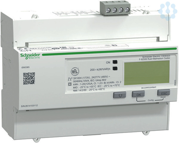 Acti 9 iEM3000 Baureihe. iEM3365 Energiezähler, 3-phasig, 1E/1A, 4 Tarife. Ausgang_K 1, COM BAC, Eingang_K 1, MID Ja, max. Bemessungsstrom 125 A. Drehstromzähler für Direktmessung bis 125 A. Anzeige vollgraphische LCD-Anzeige zur gleichzeitigen Klartextdarstellung von Menüpunkt/Messkategorie, Messwert, Einheit sowie aktivem Tarif. Teilzähler werden mit Zeitstempel (Datum&Uhrzeit) der letzten Rücksetzung angezeigt bzw. kommuniziert. Messfunktion Gesamt-Wirkenergiezähler ohne Resetfunktion und Teil-Wirkenergiezähler mit Resetfunktion. erweiterte Messfunktion für Energiezähler über Anzeige und Kommunikation Wirk-/Blindenergiezähler und Strom pro Phase, Wirkleistung, Leistungsfaktor gesamt, Spannungsmittelwert. Nur über Kommunikation Spannung, Wirkleistung pro Phase, Frequenz. Weitere Bestelloptionen Verrechnungszählung MID konform gemäß EN 50470-3 (ehem. PTB-Zulassung), Wirkenergiezähler Gesamt und pro Phase. Schutzart Front IP 40, Gehäuse IP 20 (Hinweis zu MID Varianten für Konformität mit der Europäischen Mess
