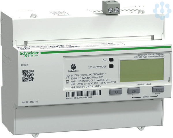 Acti 9 iEM3000 Baureihe. iEM3375 Energiezähler, 3-phasig, 1E, 4 Tarife. COM LON, Eingang_K 1, MID Ja, max. Bemessungsstrom 125 A. Drehstromzähler für Direktmessung bis 125 A. Anzeige vollgraphische LCD-Anzeige zur gleichzeitigen Klartextdarstellung von Menüpunkt/Messkategorie, Messwert, Einheit sowie aktivem Tarif. Teilzähler werden mit Zeitstempel (Datum&Uhrzeit) der letzten Rücksetzung angezeigt bzw. kommuniziert. Messfunktion Gesamt-Wirkenergiezähler ohne Resetfunktion und Teil-Wirkenergiezähler mit Resetfunktion. erweiterte Messfunktion für Energiezähler über Anzeige und Kommunikation Wirk-/Blindenergiezähler und Strom pro Phase, Wirkleistung, Leistungsfaktor gesamt, Spannungsmittelwert. Nur über Kommunikation Spannung, Wirkleistung pro Phase, Frequenz. Weitere Bestelloptionen Verrechnungszählung MID konform gemäß EN 50470-3 (ehem. PTB-Zulassung), Wirkenergiezähler Gesamt und pro Phase. Schutzart Front IP 40, Gehäuse IP 20 (Hinweis zu MID Varianten für Konformität mit der Europäischen Messgeräterichtlinie