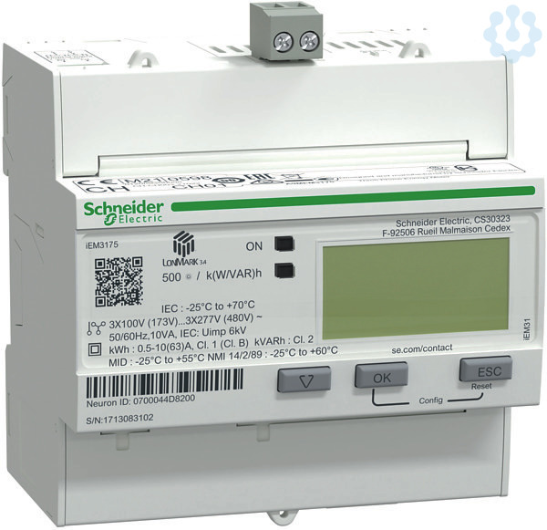 Acti 9 iEM3000 Baureihe. iEM3175 Energiezähler, 3-phasig, erweiterte Messfunktion, 1E. COM LON, Eingang_K 1, MID Ja, max. Bemessungsstrom 63 A. Drehstromzähler für Direktmessung bis 63 A. Anzeige vollgraphische LCD-Anzeige zur gleichzeitigen Klartextdarstellung von Menüpunkt/Messkategorie, Messwert, Einheit sowie aktivem Tarif. Teilzähler werden mit Zeitstempel (Datum&Uhrzeit) der letzten Rücksetzung angezeigt bzw. kommuniziert. Messfunktion Gesamt-Wirkenergiezähler ohne Resetfunktion und Teil-Wirkenergiezähler mit Resetfunktion. Erweiterte Messfunktion für Energiezähler über Anzeige und Kommunikation Wirk-/Blindenergiezähler und Strom pro Phase, Wirkleistung, Leistungsfaktor gesamt, Spannungsmittelwert. Nur über Kommunikation Spannung, Wirkleistung pro Phase, Frequenz. Weitere Bestelloptionen Verrechnungszählung MID konform gemäß EN 50470-3 (ehem. PTB-Zulassung), Wirkenergiezähler Gesamt und pro Phase. Schutzart Front IP 40, Gehäuse IP 20 (Hinweis zu MID Varianten für Konformität mit der Europäischen Messger