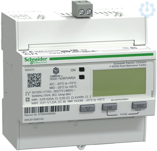 Acti 9 iEM3000 Baureihe. iEM3275 Energiezähler, 3-phasig, erweiterte Messfunktion, 1E. COM LON, Eingang_K 1, MID Ja, max. Bemessungsstrom 1 / 5. Drehstromzähler für Wandlermessung x/1 A bzw. x/5 A bis 6300 A. Spannungswandler geeignet für Messungen > 480 V AC z. B. Mittelspannungsanwendungen. Anzeige vollgraphische LCD-Anzeige zur gleichzeitigen Klartextdarstellung von Menüpunkt/Messkategorie, Messwert, Einheit sowie aktivem Tarif. Teilzähler werden mit Zeitstempel (Datum&Uhrzeit) der letzten Rücksetzung angezeigt bzw. kommuniziert. Messfunktion Gesamt-Wirkenergiezähler ohne Resetfunktion und Teil-Wirkenergiezähler mit Resetfunktion. erweiterte Messfunktion für Energiezähler über Anzeige und Kommunikation Wirk-/Blindenergiezähler und Strom pro Phase, Wirkleistung, Leistungsfaktor gesamt, Spannungsmittelwert. Nur über Kommunikation Spannung, Wirkleistung pro Phase, Frequenz. Weitere Bestelloptionen Verrechnungszählung MID konform gemäß EN 50470-3 (ehem. PTB-Zulassung), Wirkenergiezähler Gesamt und pro Phase. S