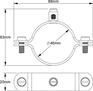 Erdungs-Rohrschelle mit Nietkontakt, zur Sicherstellung des Potentialausgleichs nach DIN VDE 0100..., für die Verwendung in trockenen Innenräumen, verwendbar für verzinkte Rohre. Abmessungen (ca. Maße) H x B x T : 60 x 88 x 20 mm für Rohr-Ø